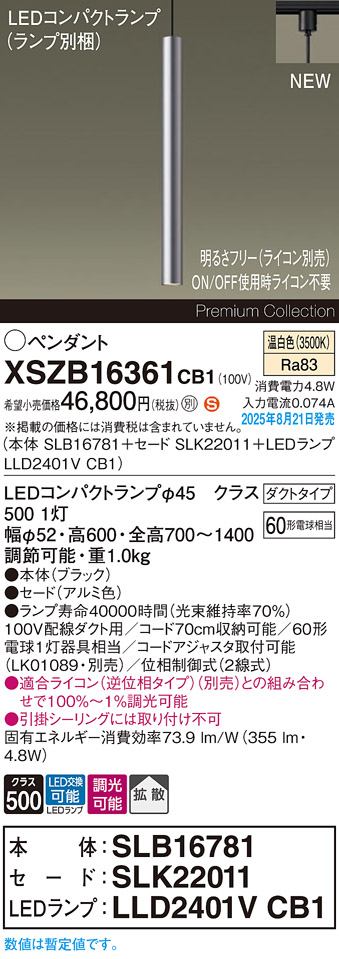 パナソニック XSZB16361CB1(ランプ別梱) ペンダント 調光(ライコン別売) LED(温白色) 配線ダクト取付型 拡散タイプ LEDコンパクトランプ交換型