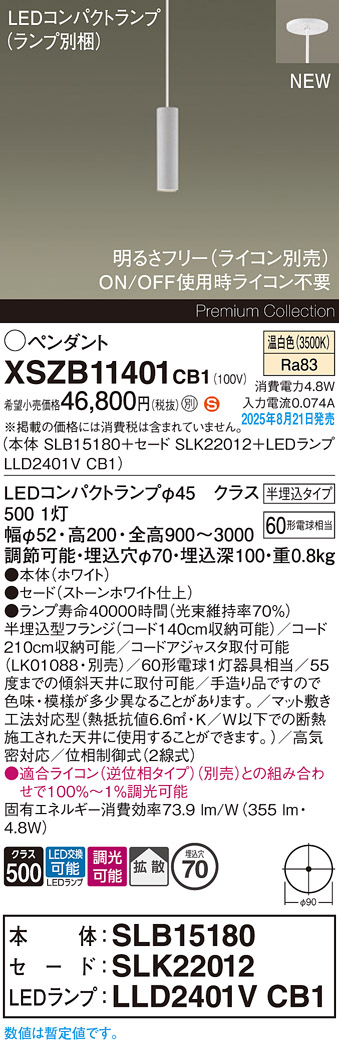 パナソニック XSZB11401CB1(ランプ別梱) ペンダント 調光 ライコン別売 LED 温白色 天井半埋込吊下型 拡散タイプ LEDコンパクトランプ交換型 ストーンホワイト