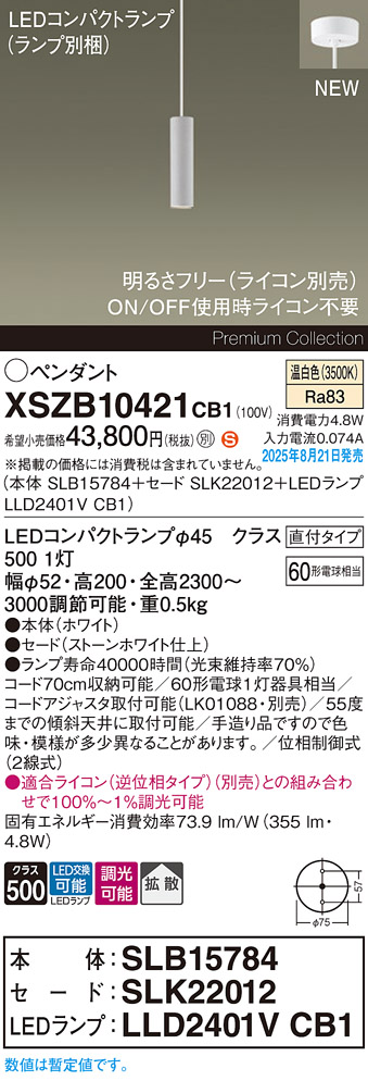 パナソニック XSZB10421CB1(ランプ別梱) ペンダント 調光 ライコン別売 LED 温白色 天井吊下型 拡散 直付タイプ LEDコンパクトランプ交換型 ストーンホワイト