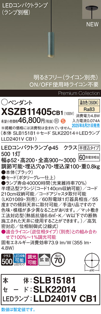 パナソニック XSZB11405CB1(ランプ別梱) ペンダント 調光(ライコン別売) LED(温白色) 天井半埋込吊下型 拡散タイプ LEDコンパクトランプ交換型 ポタリーグレー