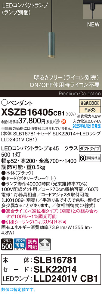 パナソニック XSZB16405CB1(ランプ別梱) ペンダント 調光 ライコン別売 LED(温白色) 配線ダクト取付型 拡散タイプ LEDコンパクトランプ交換型 ポタリーグレー [戻る]