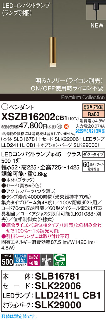 パナソニック XSZB16202CB1(ランプ別梱) ペンダント 調光(ライコン別売) LED(電球色) 配線ダクト取付型 集光48度 LEDコンパクトランプ交換型 真ちゅう色