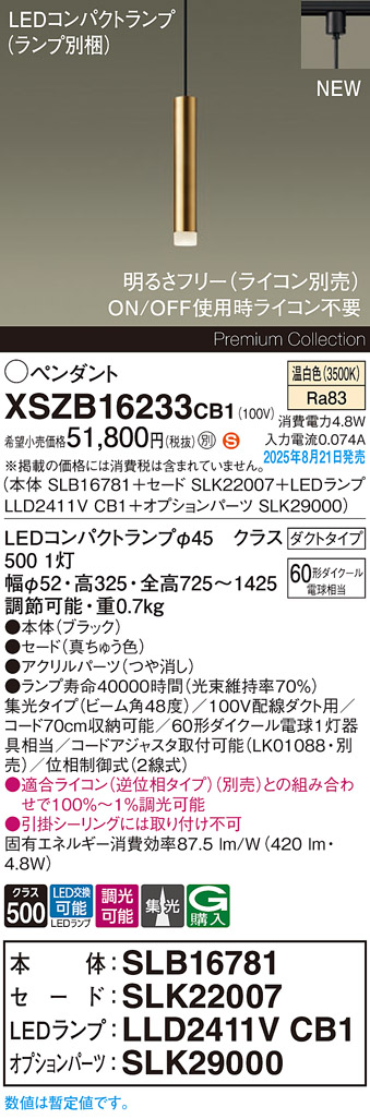 パナソニック XSZB16233CB1(ランプ別梱) ペンダント 調光(ライコン別売) LED(温白色) 配線ダクト取付型 集光48度 LEDコンパクトランプ交換型 真ちゅう色 [戻る]