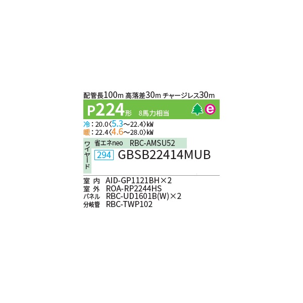 日本キヤリア/旧東芝 GBSB22414MUB 業務用エアコン 天井埋込形 ビルトイン スーパーパワーエコ ゴールド 同時ツイン P224形 8馬力 三相200V ワイヤード ♪∀