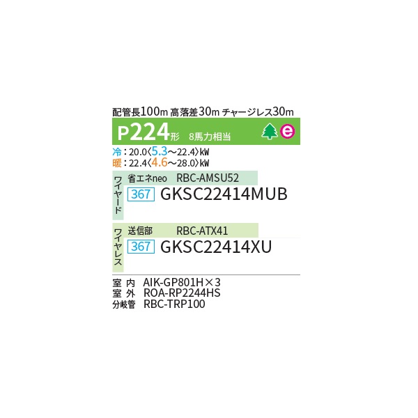 日本キヤリア/旧東芝 GKSC22414MUB 業務用エアコン 壁掛形 スーパーパワーエコ ゴールド 同時トリプル P224形 8馬力 三相200V ワイヤード ♪∀
