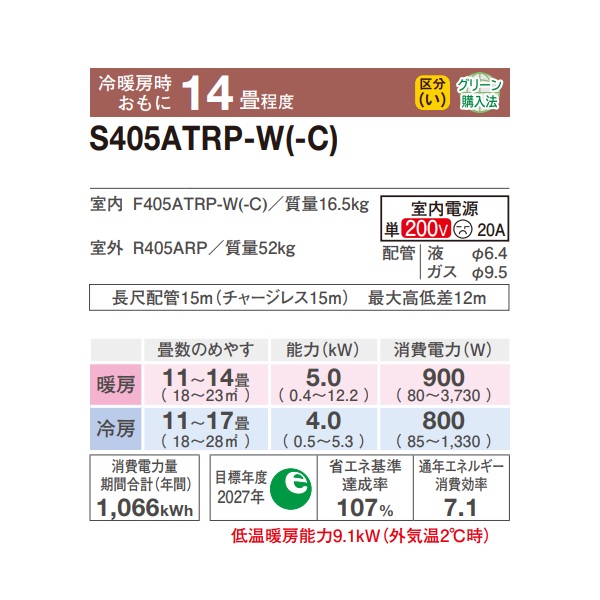 [在庫あり] ダイキン S405ATRP-W エアコン 14畳 ルームエアコン RXシリーズ うるるとさらら 単相200V 20A 14畳程度 ホワイト (S404ATRP-W 後継品) ☆2 ♭