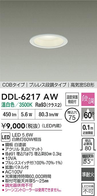 大光電機(DAIKO) DDL-6217AW ダウンライト 埋込穴φ75 段調 温白色 LED内臓 高気密SB型 ホワイト