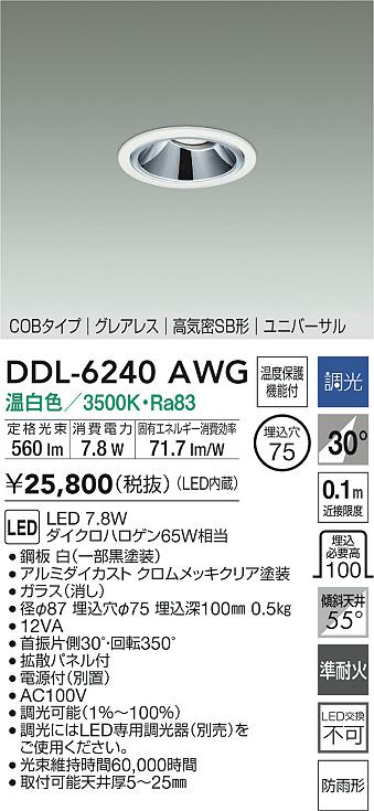 大光電機(DAIKO) DDL-6240AWG ダウンライト 埋込穴φ75 調光(調光器別売) 温白色 LED内蔵 電源別置 COB グレアレス 高気密SB形 ユニバーサル 防雨形 ホワイト