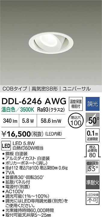 大光電機(DAIKO) DDL-6246AWG ダウンライト 埋込穴φ100 調光(調光器別売) 温白色 LED内蔵 電源付(別置) COBタイプ 高気密SB形 ユニバーサル ホワイト