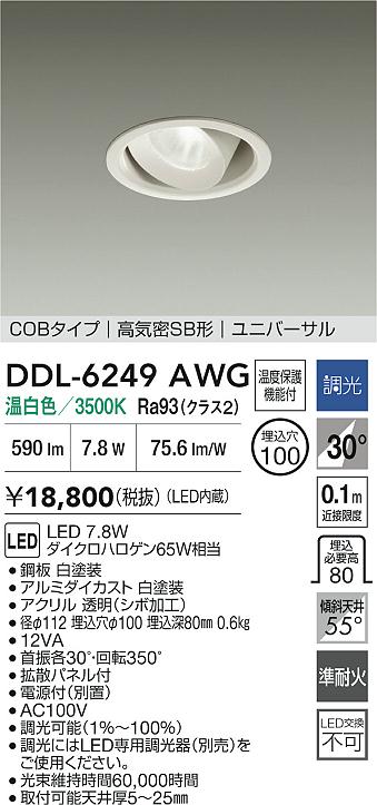 大光電機(DAIKO) DDL-6249AWG ダウンライト 埋込穴φ100 調光(調光器別売) 温白色 LED内蔵 電源付(別置) COBタイプ 高気密SB形 ユニバーサル ホワイト