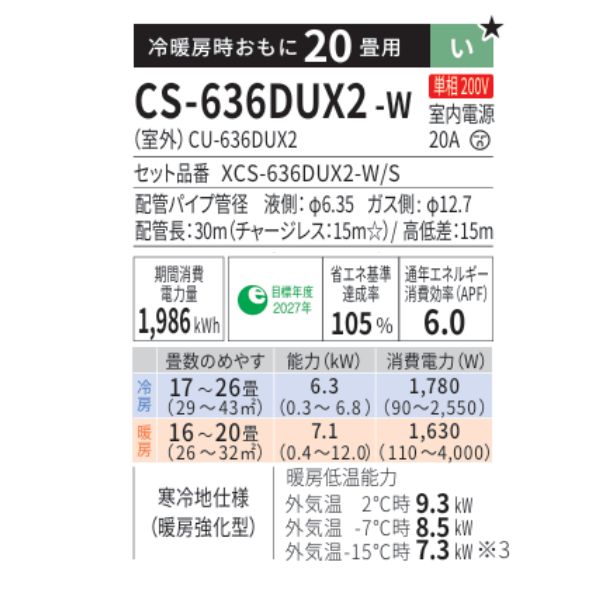 パナソニック CS-636DUX2-W エアコン 20畳 ルームエアコン UXシリーズ フル暖 エオリア 寒冷地 単相200V 20畳程度 クリスタルホワイト (CS-UX635D2-Wの後継品)