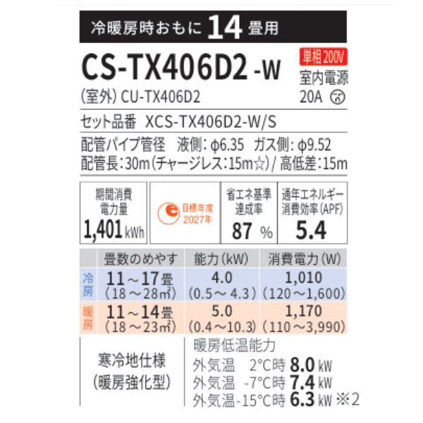 パナソニック CS-TX406D2-W エアコン 14畳 ルームエアコン TXシリーズ フル暖 エオリア 寒冷地 単相200V 14畳程度 クリスタルホワイト (CS-TX405D2-Wの後継品)