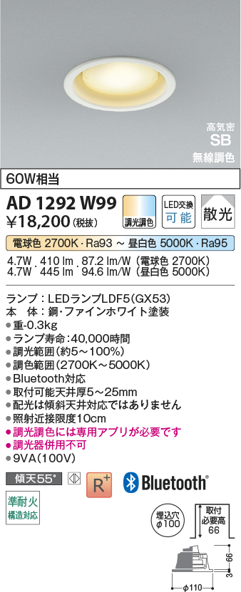 コイズミ照明 AD1292W99 ダウンライト φ100 調光調色 Bluetooth ランプタイプ 高気密SB 高演色R+ ファインホワイト