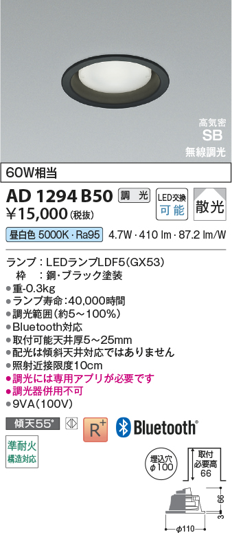 コイズミ照明 AD1294B50 ダウンライト φ100 調光 Bluetooth 昼白色 ランプタイプ 高気密SB 高演色R+ ブラック
