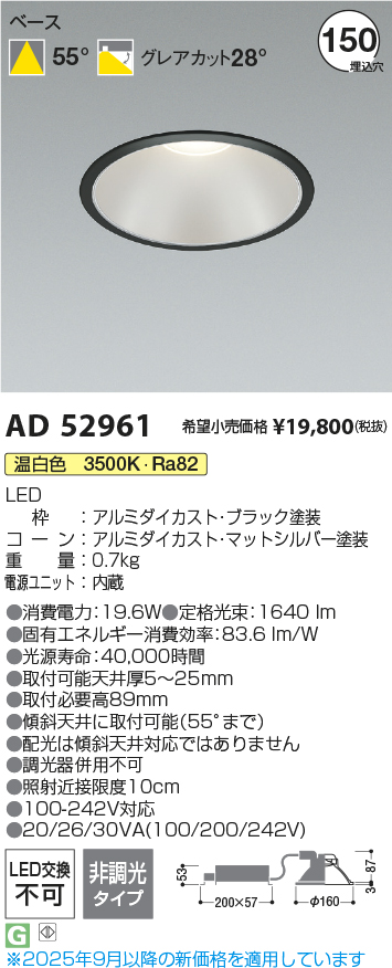 コイズミ照明 AD52961 ダウンライト φ150 非調光 温白色 M形 電源一体型 ブラック