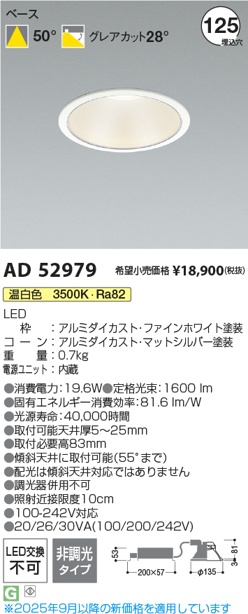コイズミ照明 AD52979 ダウンライト φ125 非調光 温白色 M形 電源一体型 ファインホワイト