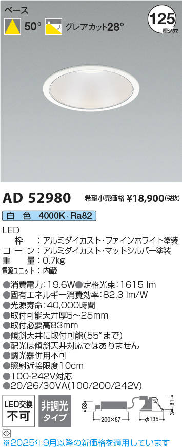 コイズミ照明 AD52980 ダウンライト φ125 非調光 白色 M形 電源一体型 ファインホワイト