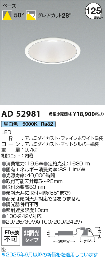 コイズミ照明 AD52981 ダウンライト φ125 非調光 昼白色 M形 電源一体型 ファインホワイト [戻る]