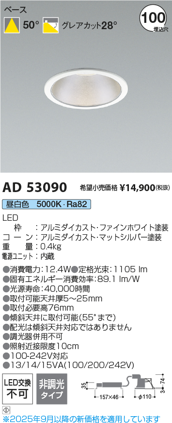 コイズミ照明 AD53090 ダウンライト φ100 非調光 昼白色 M形 電源一体型 ファインホワイト