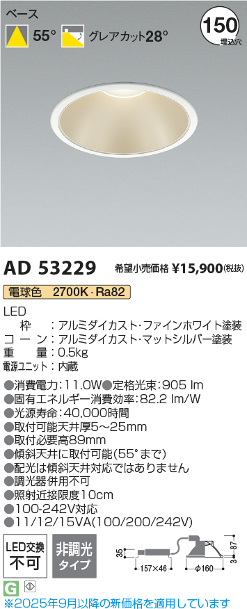 コイズミ照明 AD53229 ダウンライト φ150 非調光 電球色 M形 電源一体型 ファインホワイト [戻る]
