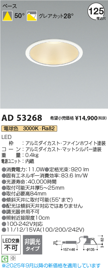 コイズミ照明 AD53268 ダウンライト φ125 非調光 電球色 M形 電源一体型 ファインホワイト [戻る]