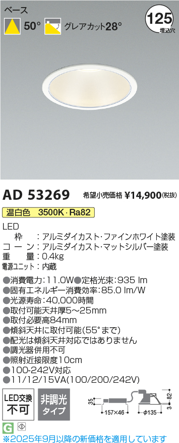 コイズミ照明 AD53269 ダウンライト φ125 非調光 温白色 M形 電源一体型 ファインホワイト