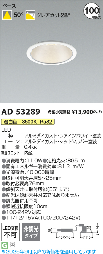 コイズミ照明 AD53289 ダウンライト φ100 非調光 温白色 M形 電源一体型 ファインホワイト