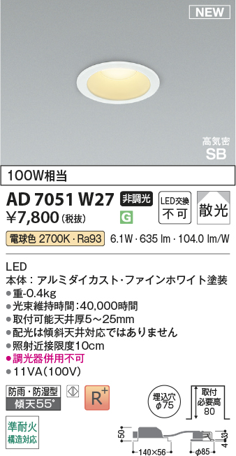 コイズミ照明 AD7051W27 ダウンライト φ75 非調光 電球色 パネル 高気密SB 高演色R+ 防雨・防湿型 ファインホワイト [戻る]