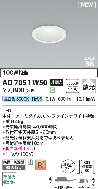 コイズミ照明 AD7051W50 ダウンライト φ75 非調光 昼白色 パネル 高気密SB 高演色R+ 防雨・防湿型 ファインホワイト
