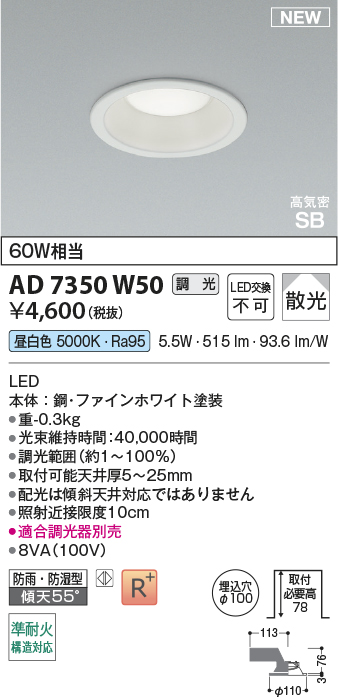 コイズミ照明 AD7350W50 ダウンライト φ100 調光(調光器別売) 昼白色 パネル 高気密SB 高演色R+ 防雨・防湿型 ファインホワイト [戻る]