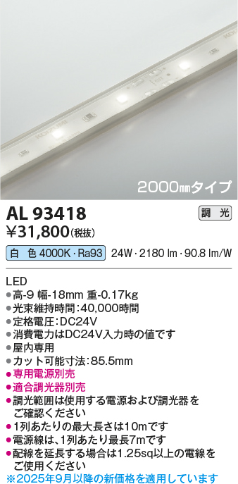 コイズミ照明 AL93418 間接照明 テープライト 2000mmタイプ 調光(調光器別売) 白色