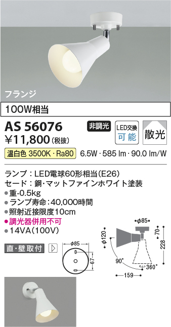 コイズミ照明 AS56076 スポットライト 非調光 温白色 ランプタイプ フランジタイプ マットファインホワイト