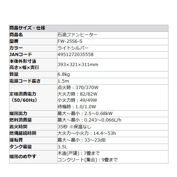 ダイニチ Dainichi FW-25S6-S 石油ファンヒーター ライトシルバー コンパクト 木造7畳 コンクリート9畳 ℃℃