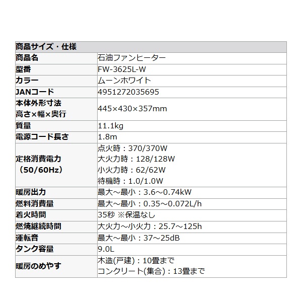 ダイニチ Dainichi FW-3625L-W 石油ファンヒーター ムーンホワイト 快速暖房 スピード着火 木造10畳 コンクリート13畳 ℃℃