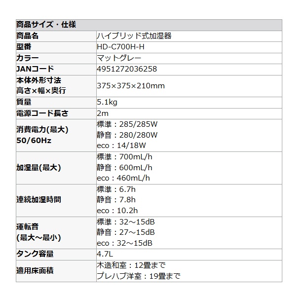 ダイニチ Dainichi HD-C700H-H ハイブリッド式加湿器 マットグレー プレハブ洋室19畳 木造和室12畳 ℃℃