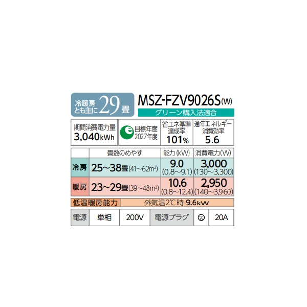三菱 MSZ-FZV9026S(W) エアコン 29畳 ルームエアコン FZシリーズ 単相200V/20A 29畳程度 ピュアホワイト (MSZ-FZV9025S-Wの後継品) ♪♭