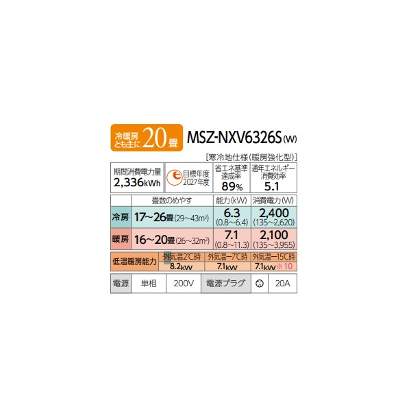 三菱 MSZ-NXV6326S(W) エアコン 20畳 ルームエアコン NXVシリーズ ズバ暖 寒冷地 単相200V/20A 20畳程度 ピュアホワイト (MSZ-NXV6325S-Wの後継品) ♪♭ [戻る]