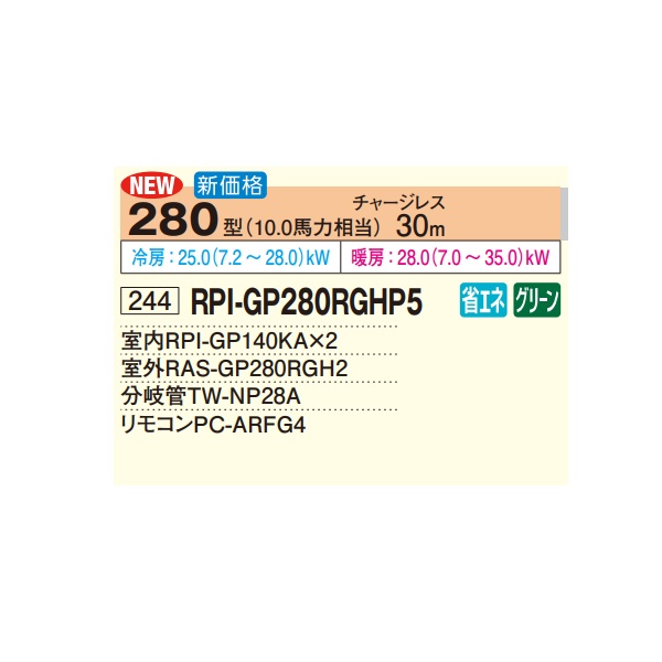 日立 RPI-GP280RGHP5 業務用エアコン てんうめ 同時ツイン 高静圧型 省エネの達人プレミアム 280型 10.0馬力 三相200V ♪