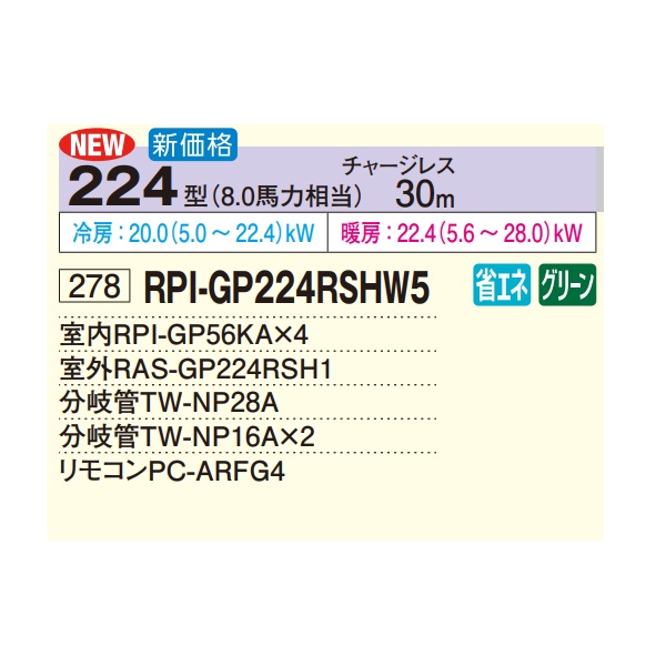 日立 RPI-GP224RSHW5 業務用エアコン てんうめ 同時フォー 高静圧型 省エネの達人 224型 8.0馬力 三相200V ♪