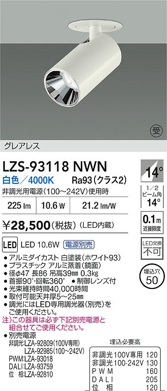 大光電機(DAIKO) LZS-93118NWN スポットライト 電源別売 白色 LED グレアレス ホワイト 受注生産品[§]