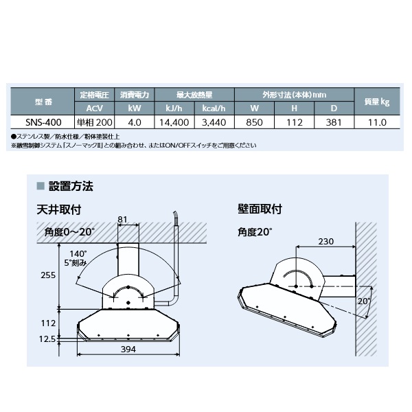 インターセントラル SNS-400 スノーヒート 輻射式遠赤外線ヒーター 融雪・屋外専用 天吊・コーナータイプ 単相200V W850×H112 受注生産品 §♪