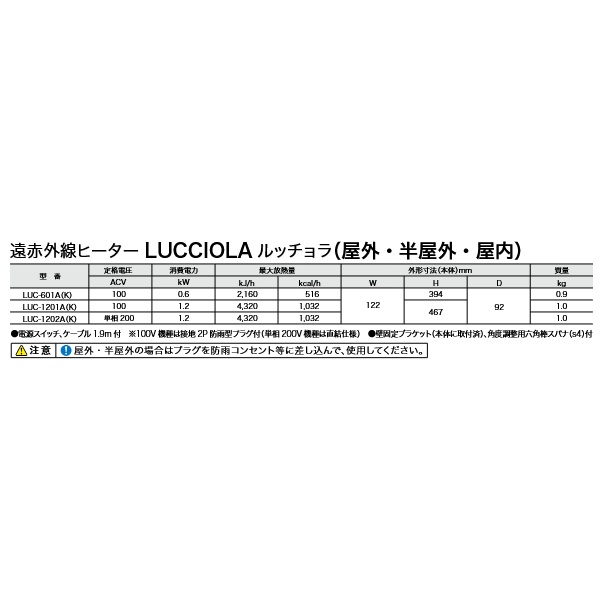 インターセントラル LUC-1202A(K) ルッチョラ 輻射式遠赤外線ヒーター 屋外・半屋外・屋内用 単相200V W122×H467♪