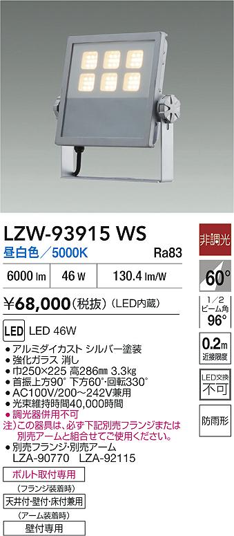 大光電機(DAIKO) LZW-93915WS アウトドア ウォールスポット 非調光 灯具本体 アーム別売 電源内蔵 昼白色 LED 防雨形 シルバー