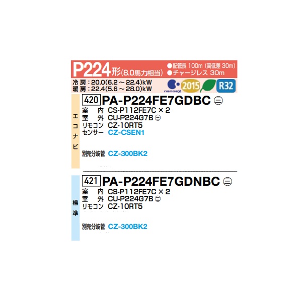 パナソニック 『PA-P224FE7GDBC+分岐管』 業務用エアコン ビルトインオールダクト形 XEPHY Premium エコナビ 同時ツイン P224形 8.0馬力 三相200V ♪