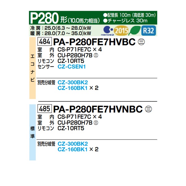 パナソニック 『PA-P280FE7HVNBC+分岐管』 業務用エアコン ビルトインオールダクト形 XEPHY Eco 標準 同時ダブルツイン P280形 10.0馬力 三相200V ♪