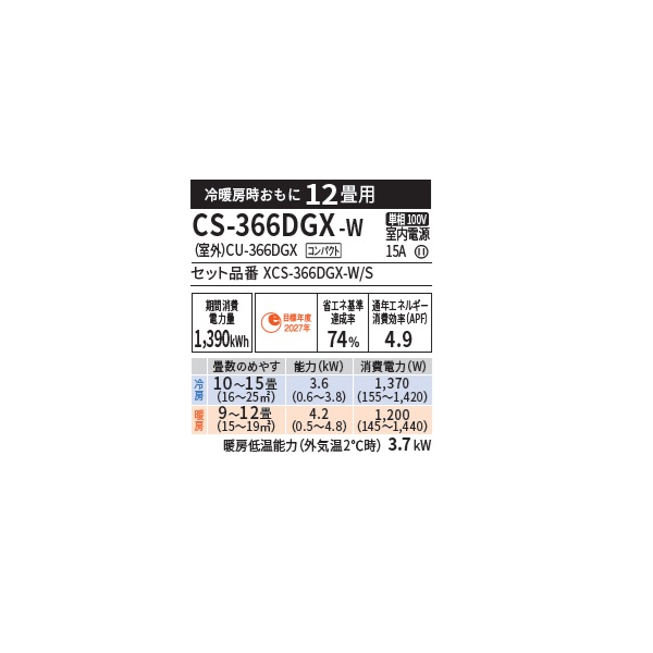パナソニック CS-366DGX-W エアコン 12畳 ルームエアコン GXシリーズ エオリア ナノイーX 単相100V 12畳程度 クリスタルホワイト (CS-365DGX-Wの後継品)