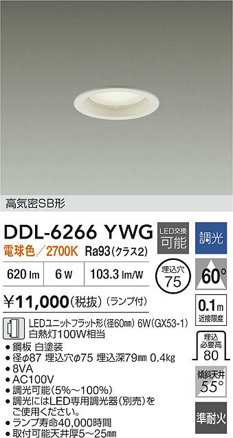 大光電機(DAIKO) DDL-6266YWG ダウンライト 埋込穴φ75 調光(調光器別売) 電球色 LED ランプ付 高気密SB形 ホワイト