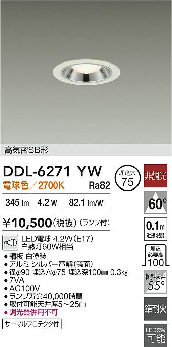大光電機(DAIKO) DDL-6271YW ダウンライト 埋込穴φ75 非調光 電球色 LED ランプ付 高気密SB形 ホワイト