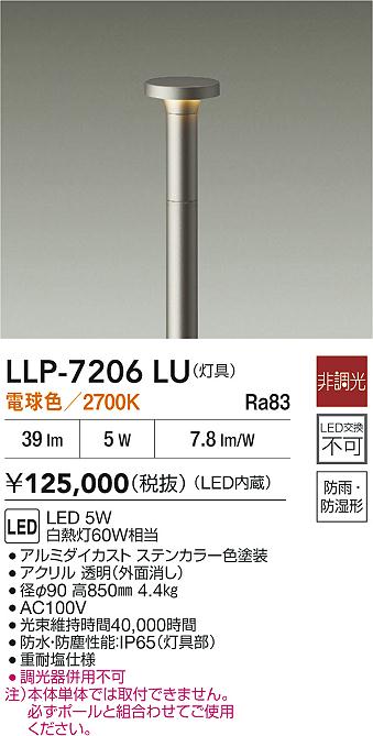 大光電機(DAIKO) LLP-7206LU アウトドアライト ガーデンライト 非調光 電球色 灯具本体 ポール別売 防雨・防湿型 ステンカラー [戻る]