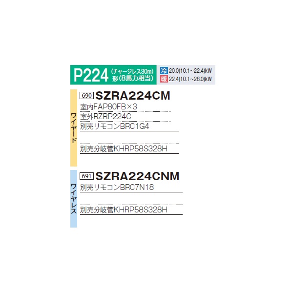 ダイキン 『SZRA224CNM+分岐管』 業務用エアコン 壁掛形 トリプル同時マルチ EcoZEAS P224形 8馬力 三相 ワイヤレス ♪